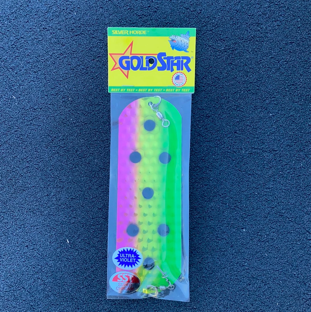 Gold star Dodgers are manufactured from top-quality brass and are equipped with salt water resistant swivels and rings standard swivel arrangement barrel swivel top end buckle swivel tail end SAMPO ball bearing swivel arrangements available where noted SAMPO swivel top end buckle swivel tail and gold star Dodgers come in package in a reusable vinyl back.