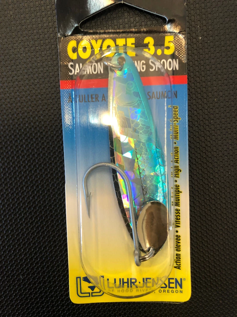 The spoons thin material creates a very active swimming action that salmon can’t resist. Sized from 3-1/2- to 6-inches in length, sizes should be chosen to match the baitfish on which salmon are feeding. Smaller sizes when candlefish and anchovies are most prevalent, larger in late season when herring become the food of choice. The Coyote spoon performs exceptionally well behind dodgers and flashers alike. Features Include: Heavy-duty construction for Salmon fishing, Rigged with welded ring on head end and heavy duty split ring with metal flipper hook on end, Premium plating and polishing for maximum flash and corrosion resistance.