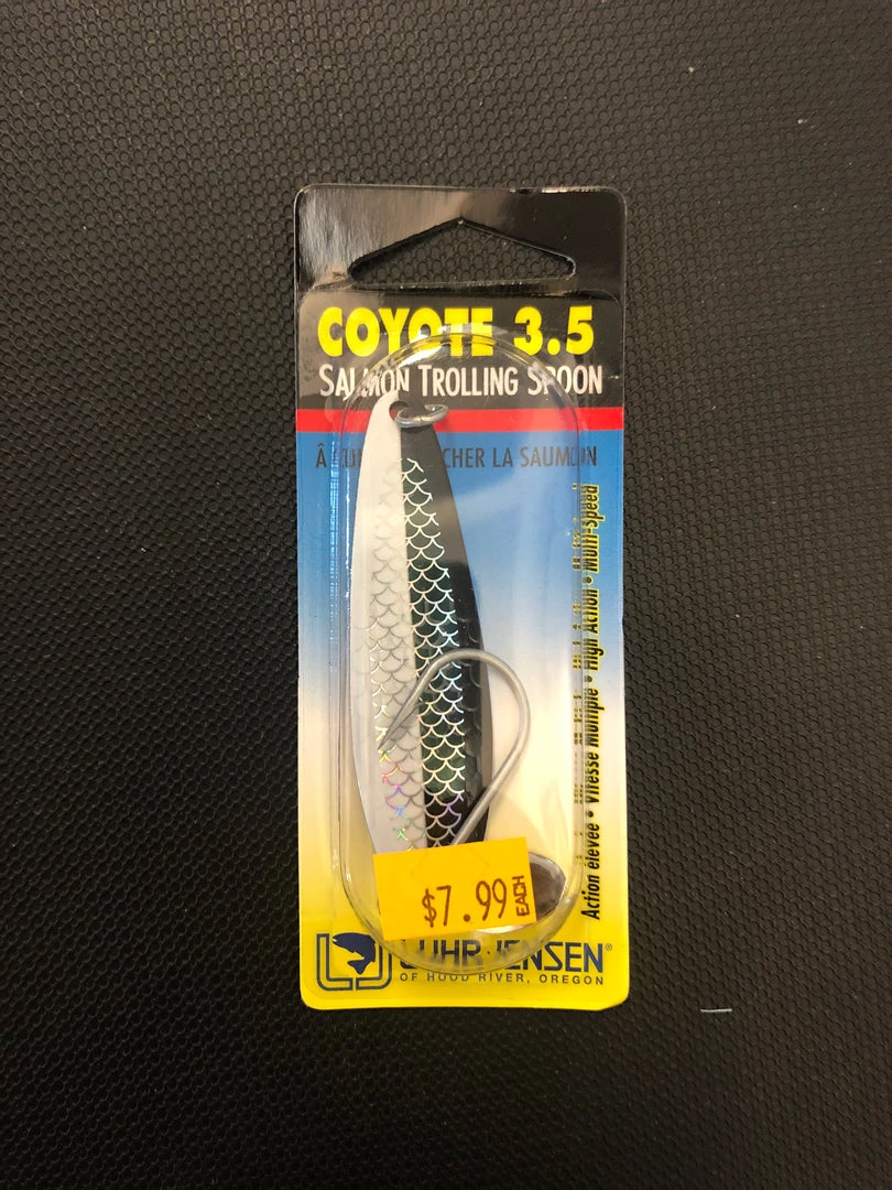 The spoons thin material creates a very active swimming action that salmon can’t resist. Sized from 3-1/2- to 6-inches in length, sizes should be chosen to match the baitfish on which salmon are feeding. Smaller sizes when candlefish and anchovies are most prevalent, larger in late season when herring become the food of choice. The Coyote spoon performs exceptionally well behind dodgers and flashers alike. Features Include: Heavy-duty construction for Salmon fishing, Rigged with welded ring on head end and heavy duty split ring with metal flipper hook on end, Premium plating and polishing for maximum flash and corrosion resistance.
