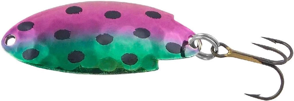 | The Thomas Buoyant minnow is unsurpassed as one deadly trout and salmon lure! First issued a U.S. patent in 1946, the Buoyant is an erratic-action wobbler that imitates the darting motion of a frantic, fleeing baitfish. This action, combined with jewelry-quality finishes, creates a spoon that entices even the wariest of trout or salmon, and many other types of game fish, into striking. Their largest 5/8 oz. size is especially deadly on northern pike! It is important to use a moderately slow retrieve or troll speed for the Buoyant to achieve its most effective action. An occasional sharp twitch of the rod tip can really draw hard strikes! Made in the U.S.A. |