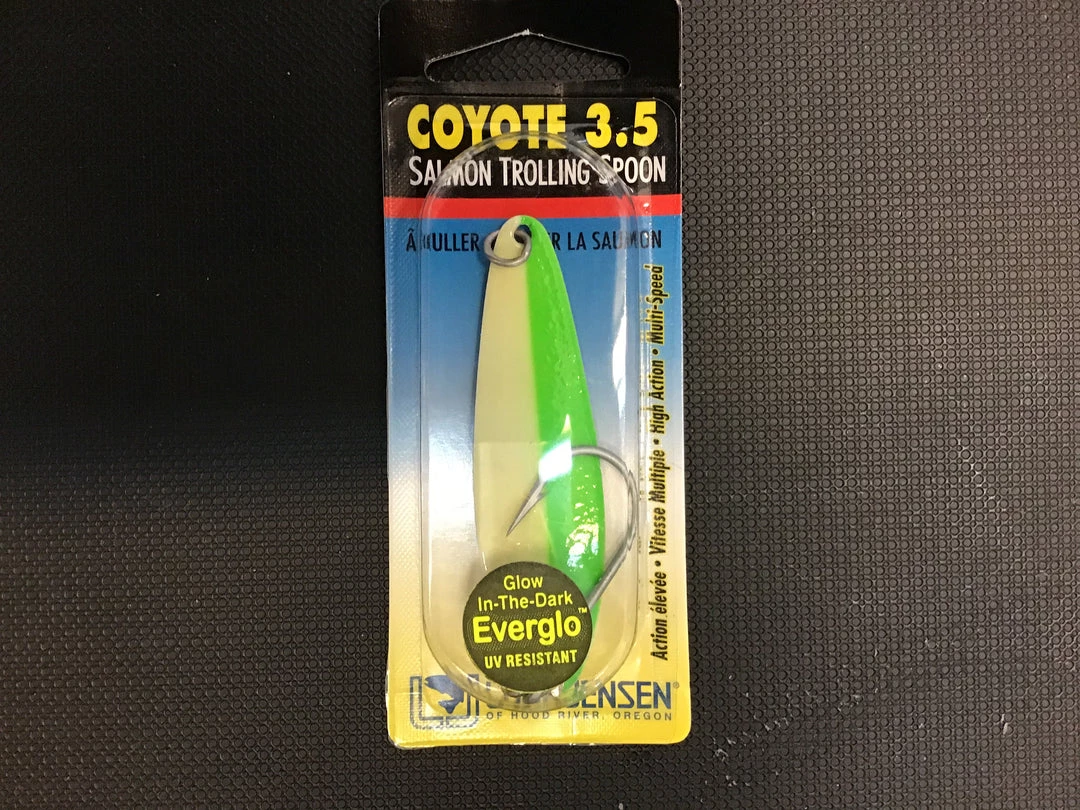 The spoons thin material creates a very active swimming action that salmon can’t resist. Sized from 3-1/2- to 6-inches in length, sizes should be chosen to match the baitfish on which salmon are feeding. Smaller sizes when candlefish and anchovies are most prevalent, larger in late season when herring become the food of choice. The Coyote spoon performs exceptionally well behind dodgers and flashers alike. Features Include: Heavy-duty construction for Salmon fishing, Rigged with welded ring on head end and heavy duty split ring with metal flipper hook on end, Premium plating and polishing for maximum flash and corrosion resistance.