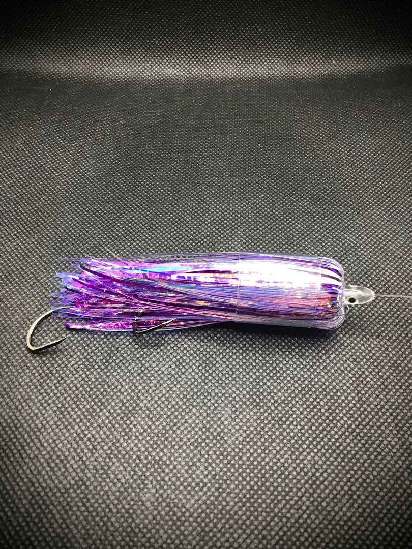 Plum crazy is made with purple material and our Blue bubble light partical light grabbing material. This fly has been a big fish producer in clear water. Rigged with 20lb leader, 6 clear glow beads and two double stacked 4/0 hooks. Prefect multi species fly.