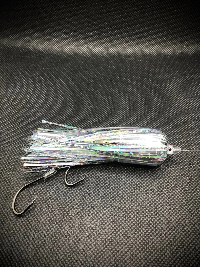 Chrome UV is made with a high flash chrome material and our UV extreme that really lights up for the fish to see. Rigged with 20lb leader glow beads and two double stacked 4/0 hooks. I find this fly works well in dark/stained water.