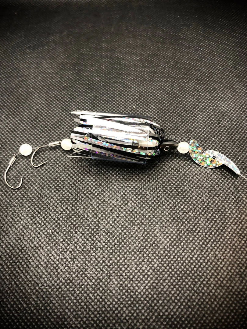 Tied on a 15lb leader with glow beads, a superfly spinner blade and two double stacked hooks.