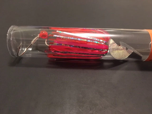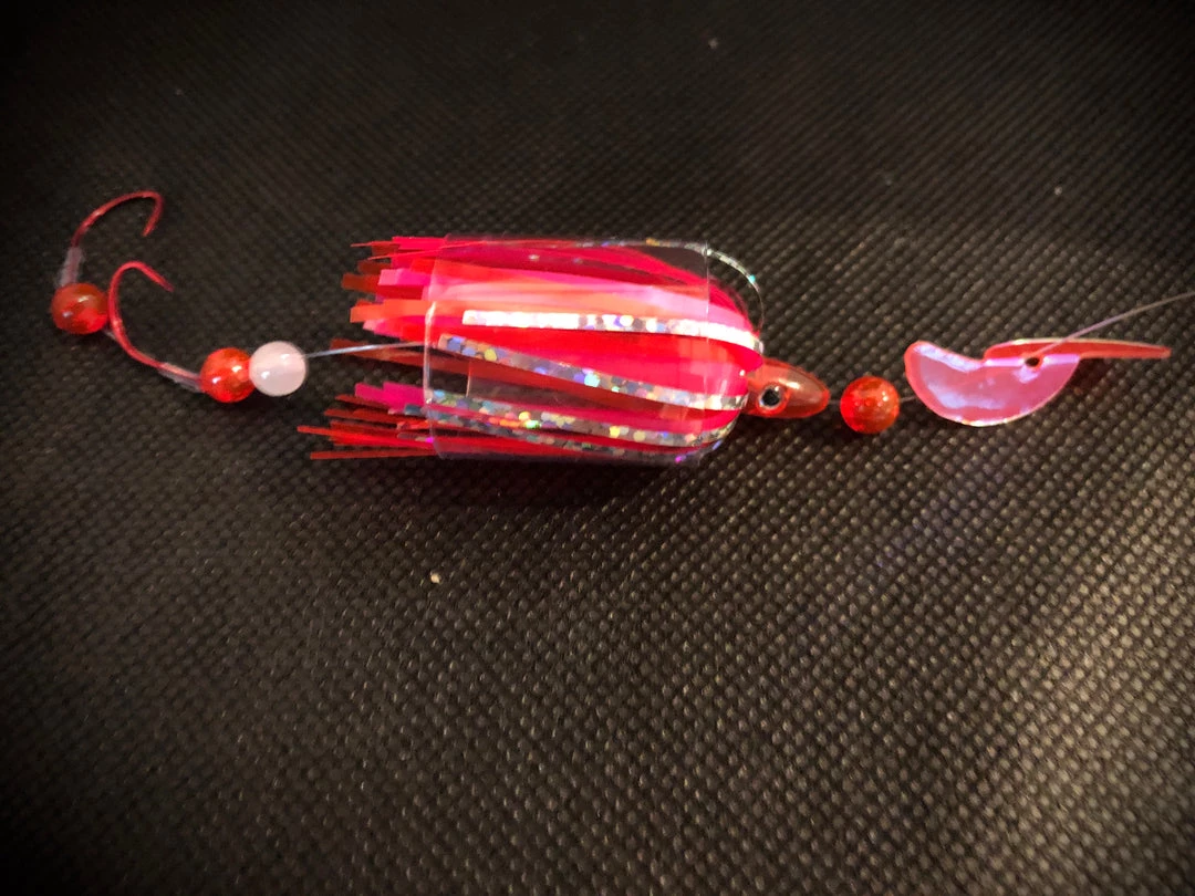 Sushi is tied together with our famous pink uv materail and a transparent orange and little silver sparkle. The fish love it and so will you!