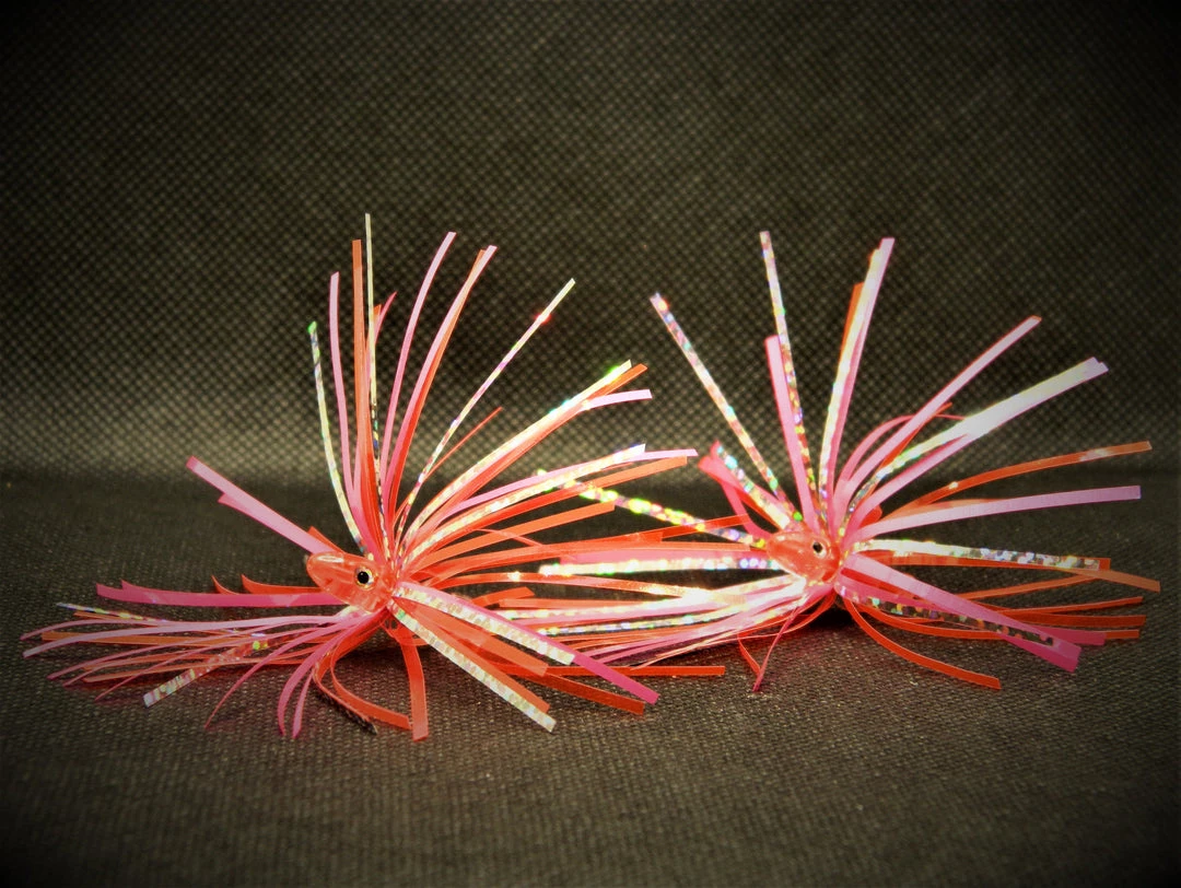 Sushi fly is made up of the UV that you have come to love, that is in our pink UV fly, and tied together with an transparent orange and a silver sparkle.