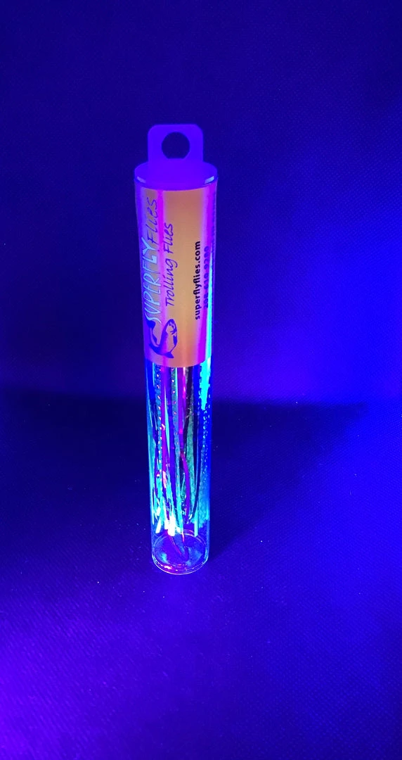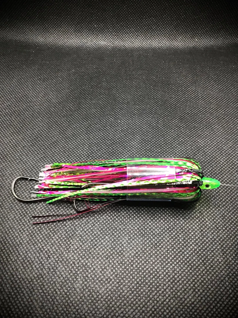 The watermelon is a long time fish catching pattern. A combination of green, pink, black and glow, tied on two double stacked 4/0 hooks using 20lb leader. The watermelon fly will quickly become your go to fly for tough fishing conditions for almost all species.