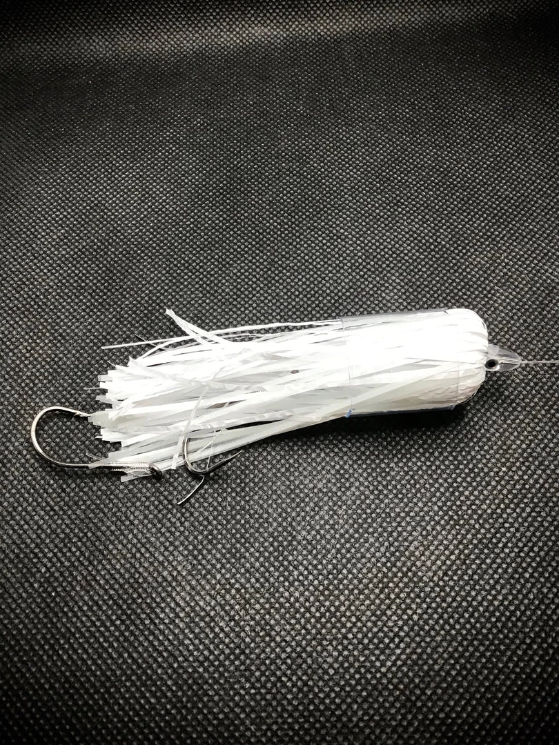 Great for landing mackinaw in your boat. The white Glow fly is tied together with two double stacked 4/0 hooks, glow beads and of course White and glow material. Work great down deep!