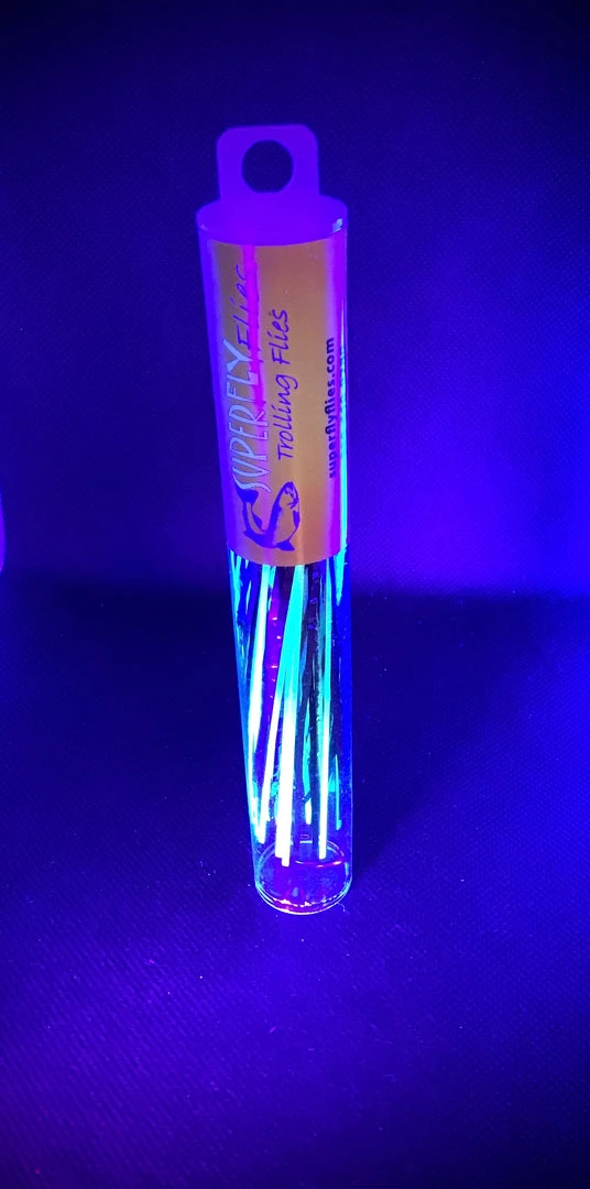 The Highly sought after Root-beer Fly has black and a chocolate gold color with glow underneath. Tied together with glow beads and two double stacked 4/0 hooks.