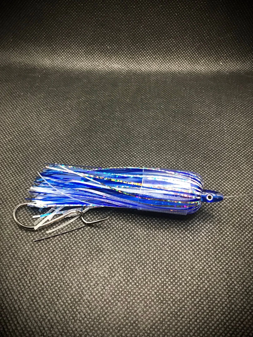 The cowboy fly mimics schooling bait fish. Its colors attract the big fish from long distances. Translucent uv blue, blue glow and chrome holographic fish scale. 20lb leader, two double stacked 4/0 hooks & blue and glow beads. The prefect fly for big fish in clear water!