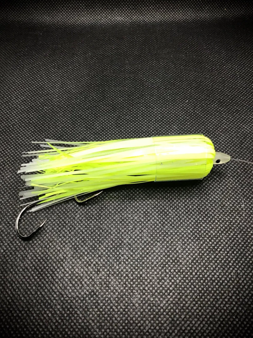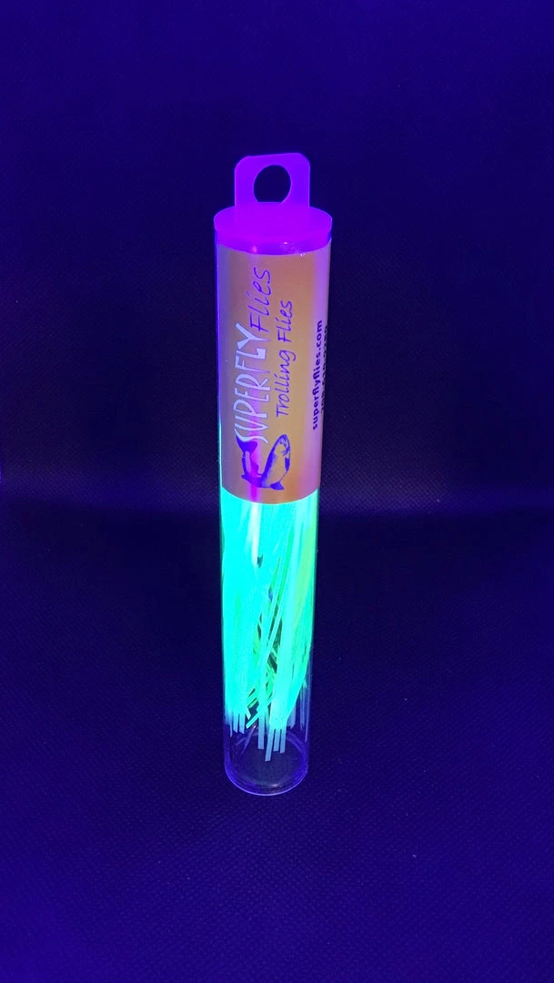 Mackinaw candy is what I call this fly! The combination of chartreuse and glow make this a deadly fly and double your fish count! Tied together on 20lb test with two double stacked 4/0 hooks with of course glow beads.
