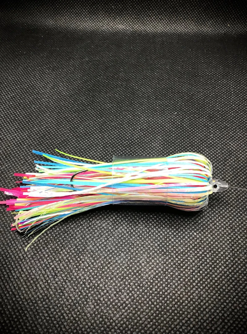 The wonderbread fly is made with white, blue UV, pink UV and yellow UV. This is favorite for deep water fish like lake trout because of the various colors of UV that stand out at deep depths. Made with 20lb leader and two double stacked 4/0 hooks. The UV beads in pink, blue and glow, blue glow beads make this fly really light up.