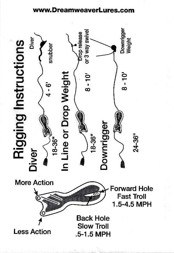 Dreamweaver’s Spin Doctor is the best deep water rotating flasher available. It has a full 360 degree rotation at slow or fast trolling speeds and is designed to pull easy for any trolling application. Leader lengths are critical, see rigging instructions below.