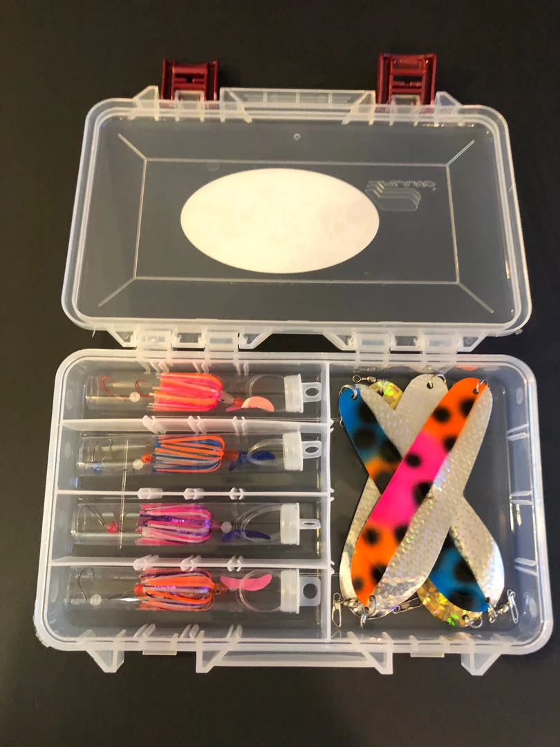 With the popularity of the 4″ bundle and save kit we decided to offer a 2″ kokanee bundle and save kit. This kit comes with 4 Super dodgers in gold, silver, blue/orange and orange/pink Four 2″ flies in Orange/pink glow, blue/orange glow, pink/purple glow and orange/purple glow. All contained in a high quality case.