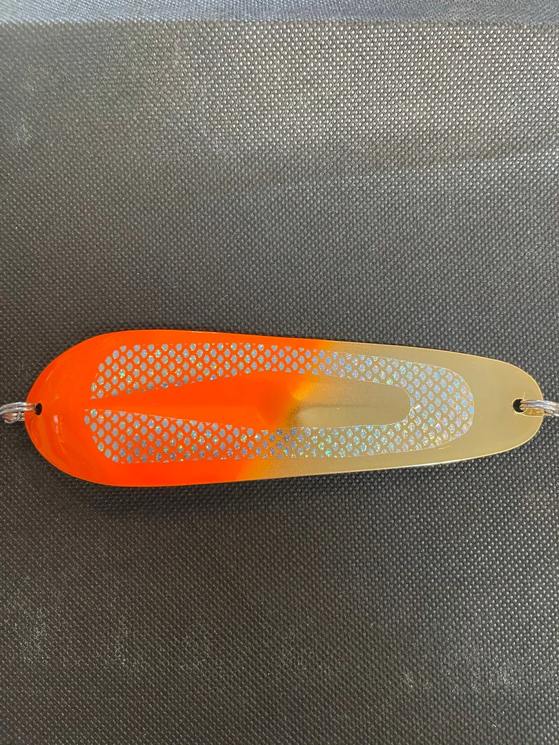 Gold/Orange dodger with silver halographic fish scale. 5.5” dodger 14kt gold platedÂ
