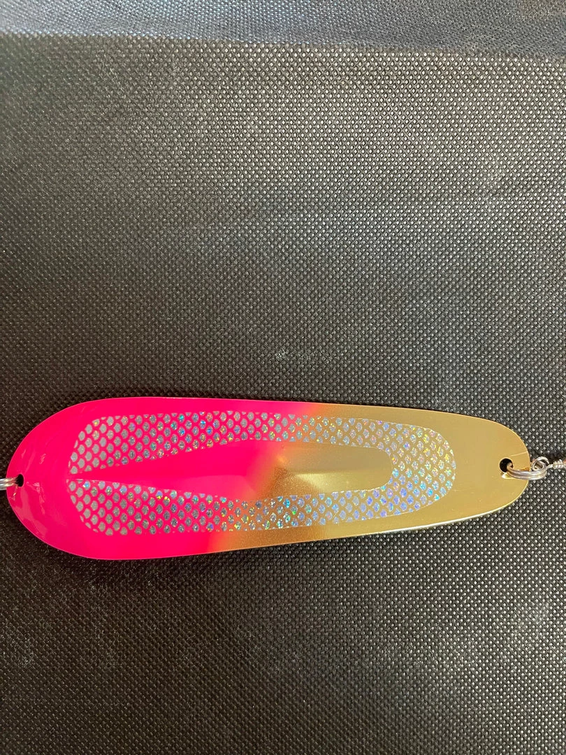 Gold/Pink dodger with silver halographic fish scale. 5.5” dodger 14kt gold platedÂ