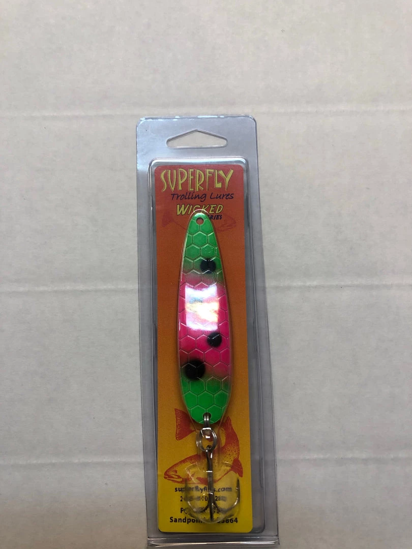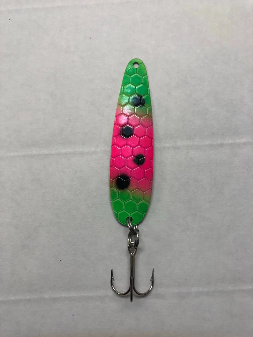The wicked watermelon is made on a light weight Trolling spoon, with honey comb pattern pressed into the metal spoon.